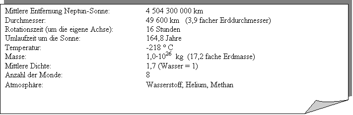 Auf Neptuns Oberfläche hat man Geysire entdeckt, deren Fontänen bis zu acht Kilometer Höhe erreichen. Neptun besitzt ebenfalls Ringe, die aber nur mit einem guten Teleskop zu sehen sind.