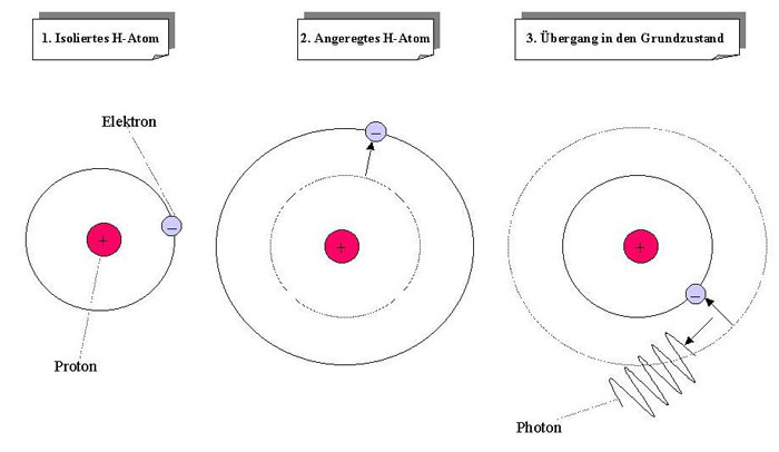 an ihm rütteln. Z.B. durch „Anregung“ des Elektrons auf ein höheres Energieniveau und „Abregung“ des Elektrons durch Abstrahlung eines Photons, welches